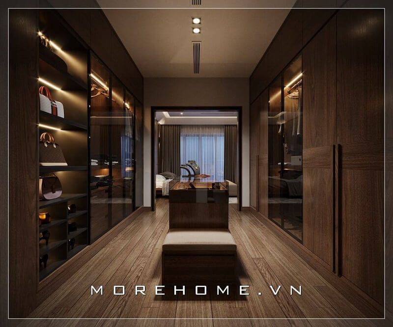 Mẫu thiết kế nội thất biệt thự sang trọng với không gian phòng thay đồ tông màu nâu trầm tinh tế, sử dụng gỗ tự nhiên cao cấp để tạo nên một không gian sống hoàn hảo cho gia chủ.