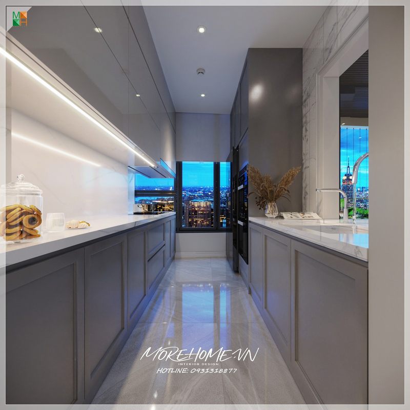 Nội thất phòng bếp của chung cư là một sự kết hợp giữa phong cách tân cổ điển và sang trọng, cùng với nhiều tiện nghi.