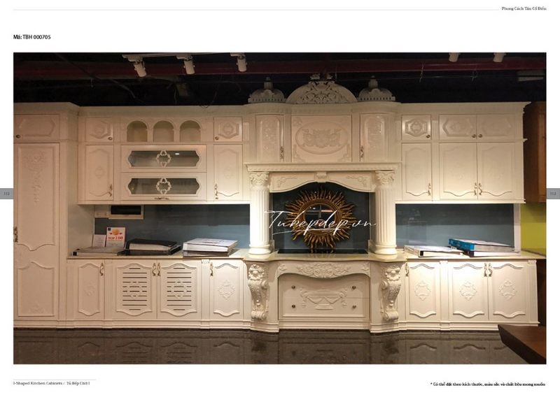 Màu trắng kết hợp với các chi tiết cầu kì nghệ thuật của tủ bếp gỗ tự nhiên tân cổ điển hoàng gia tạo nên sự sang trọng khó cưỡng